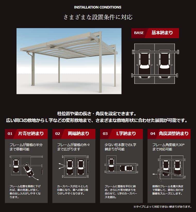 さまざまな設置条件に対応できるアゼスト。柱位置や梁の長さ・角度を設定できます。広い間口の敷地からL字などの変形敷地まで、さまざまな敷地形状に合わせた展開が可能です。