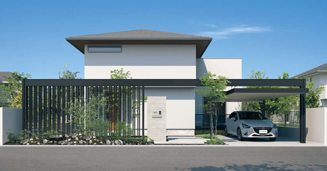 待望の業界初!間口12mのフレーム(柱・梁)で迫力のあるファサードを実現できるカーポート。豊富な屋根サイズと3つの基本構造によって多彩なルーフ計画を提案でき、シンプル&フラットなデザインが住宅外観と調和します!