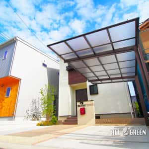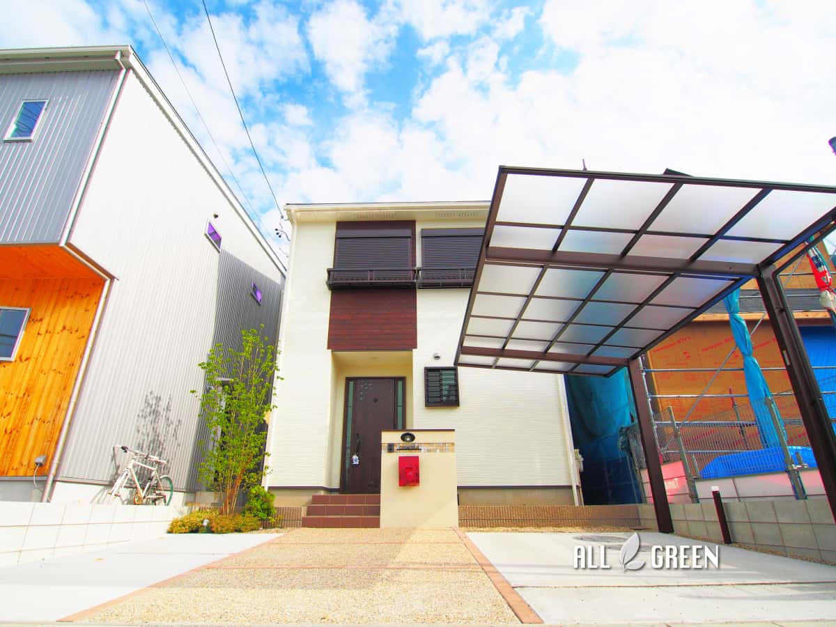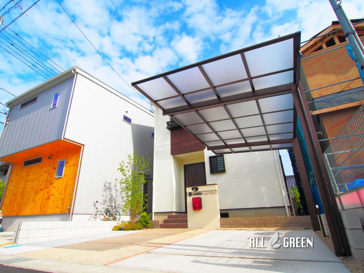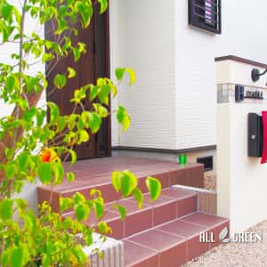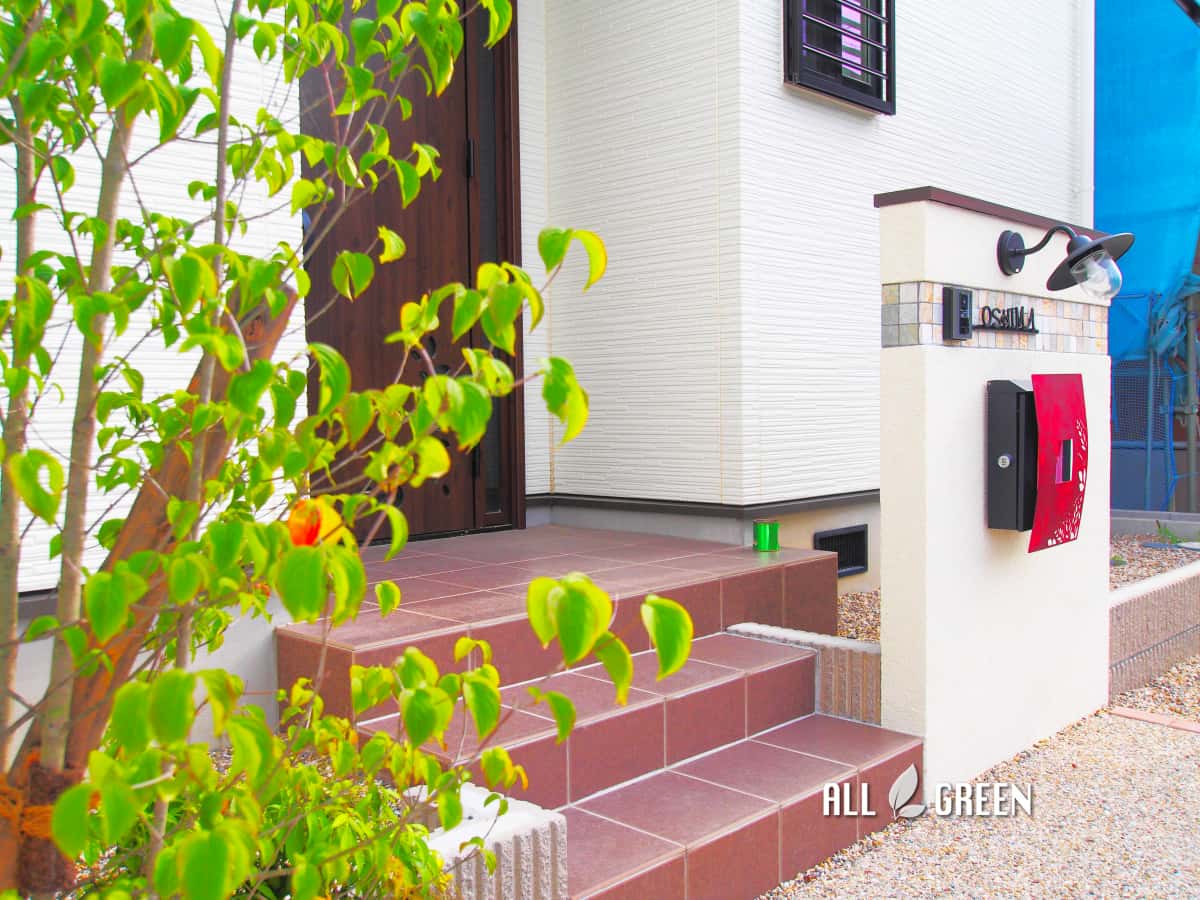 温かみある暖色系の中に光るワインレッドのオリジナルポストがアクセントカラーとなった稲沢市の新築外構デザイン