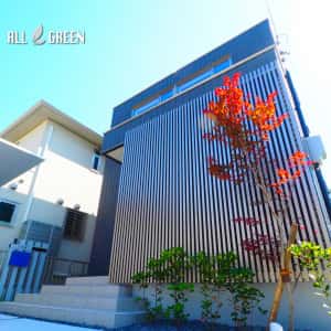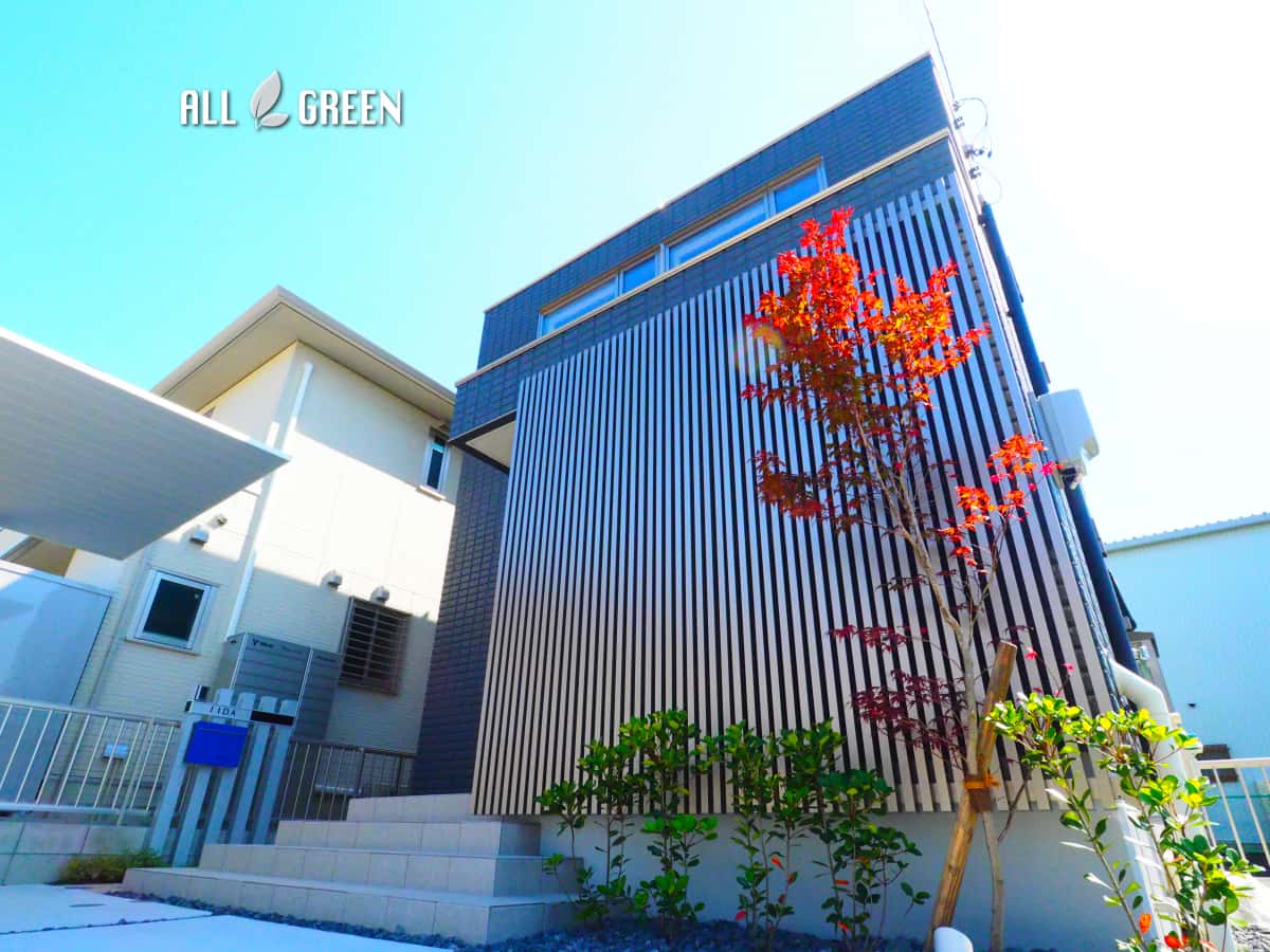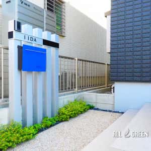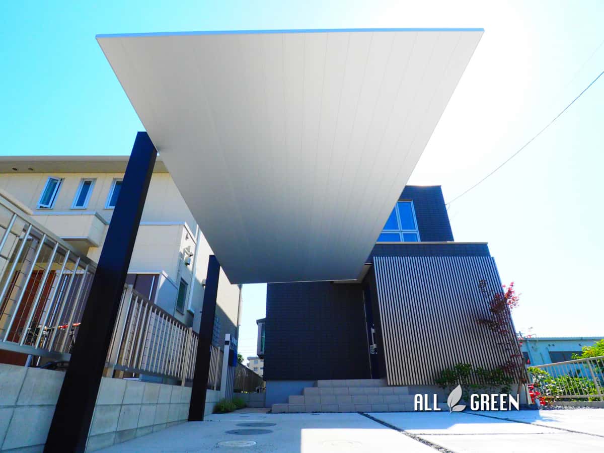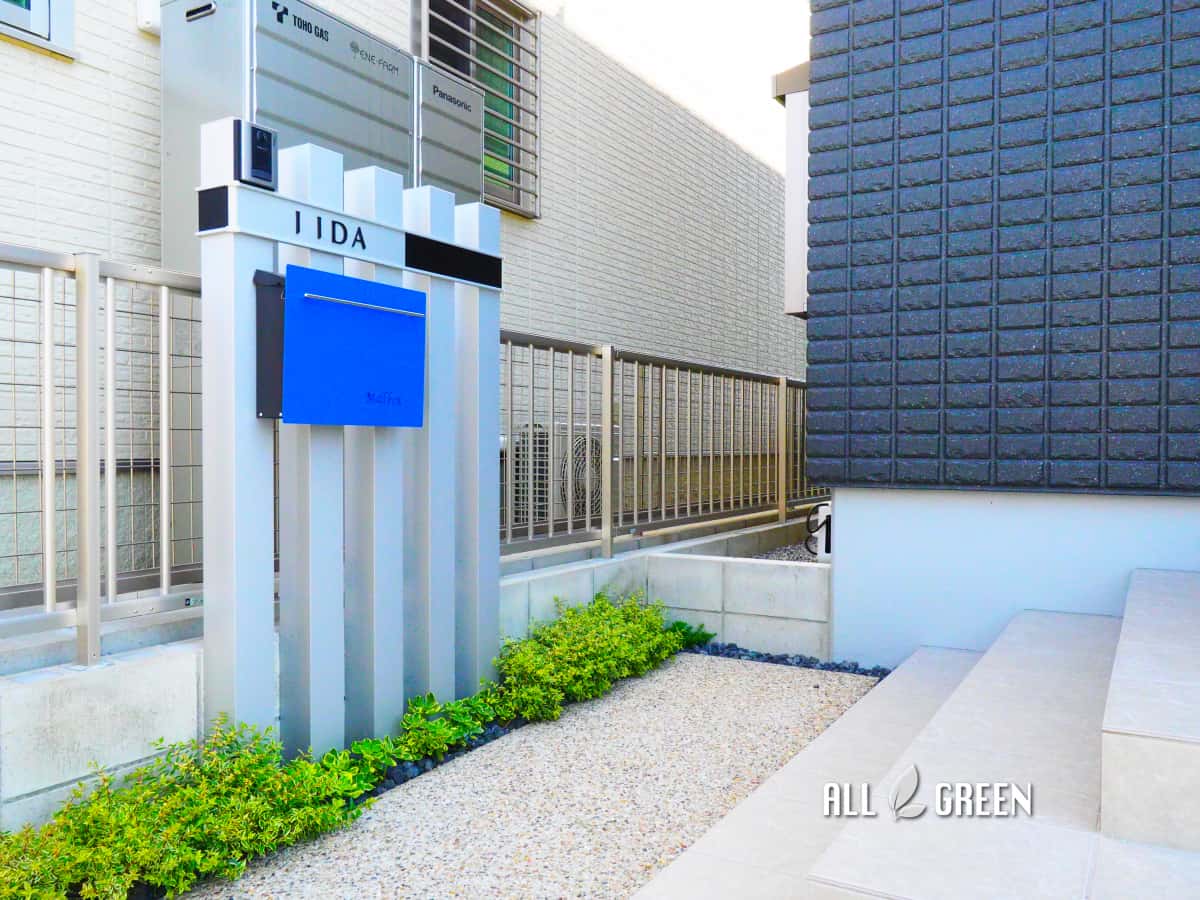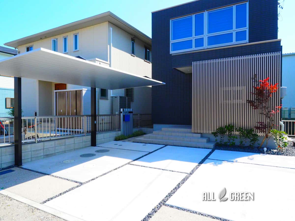 色味とフォルムの統一感を大切にした爽やかな清須市のミニマルモダンなオープン外構