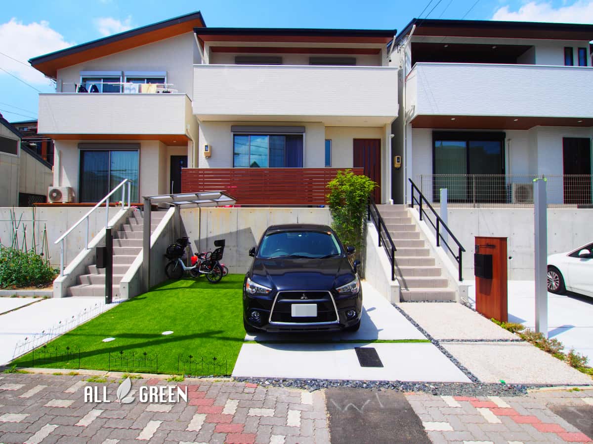 木調の門塀と人工芝の緑が目を引く名古屋市瑞穂区の新築外構工事