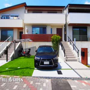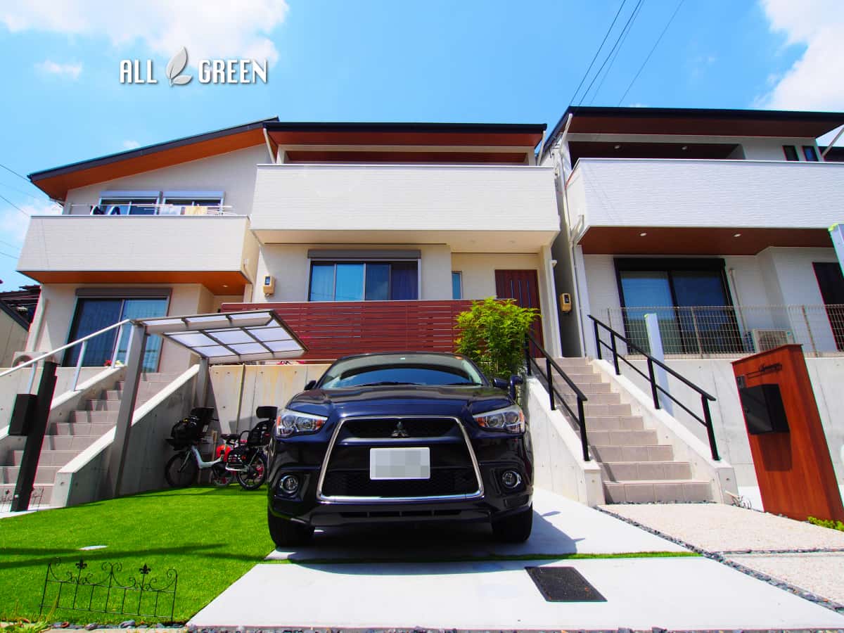 木調の門塀と人工芝の緑が目を引く名古屋市瑞穂区の新築外構工事