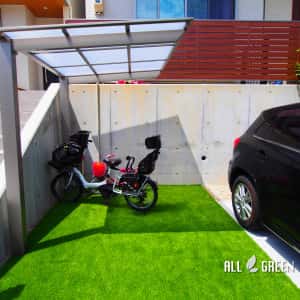 はっきりとした色の人工芝に負けないよう、はっきりとした木調色のフェンスや門柱を使いバランスを整えました。