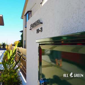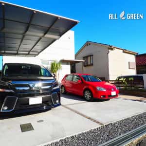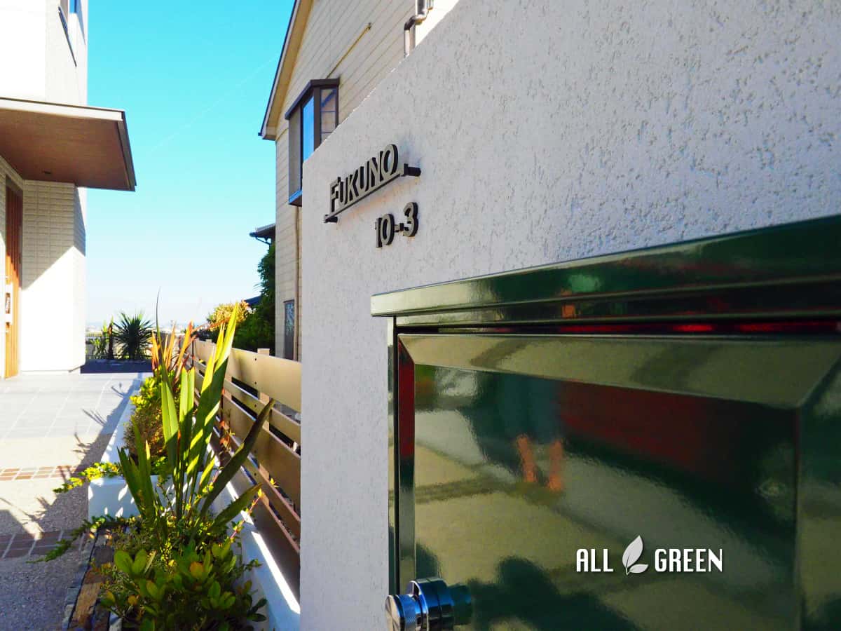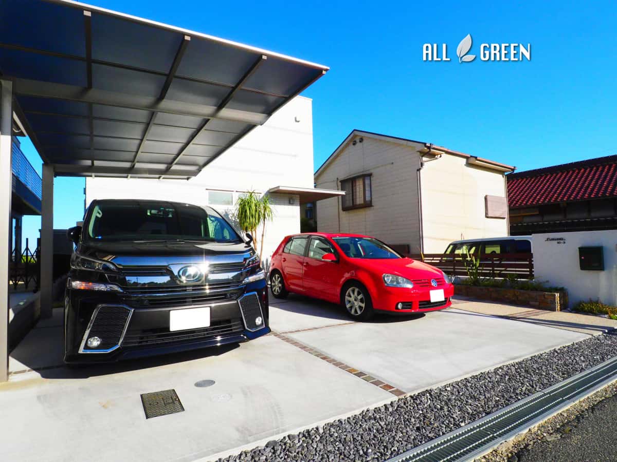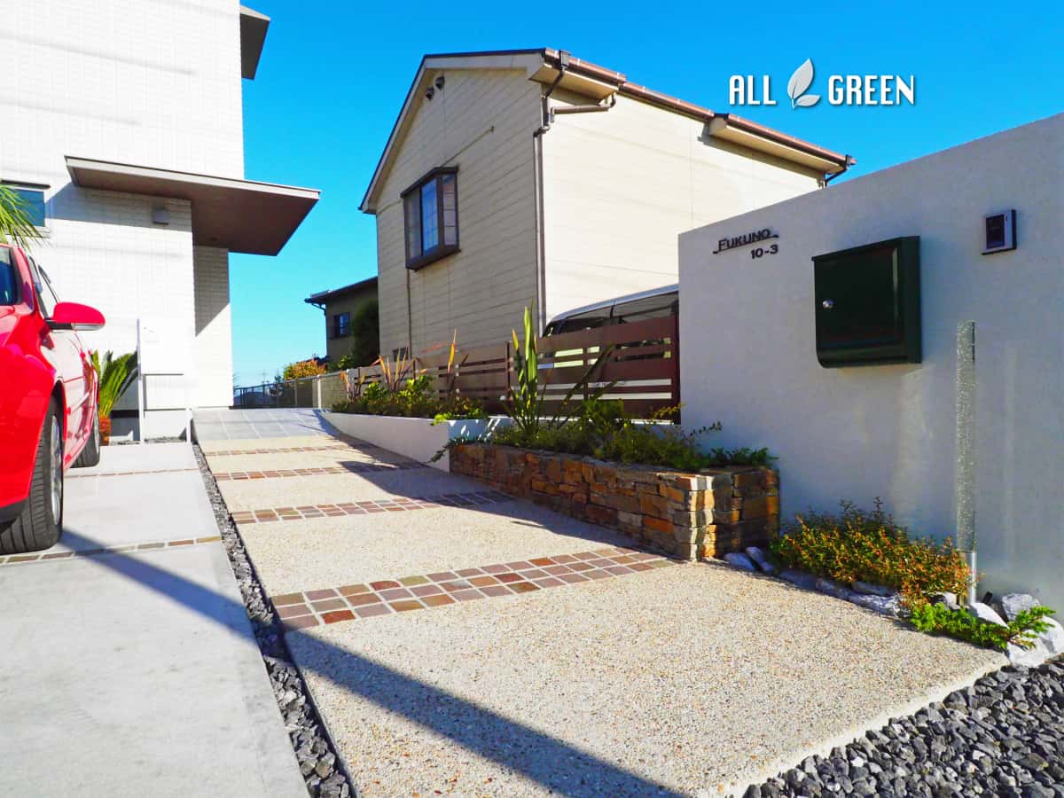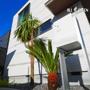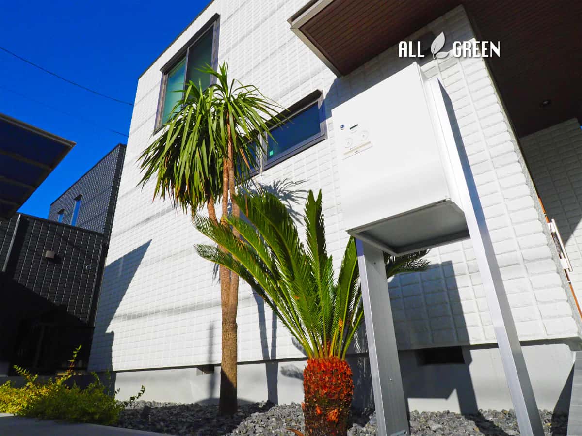 石積み花壇と南国樹木で飾った大府市のシンプルリゾート新築外構