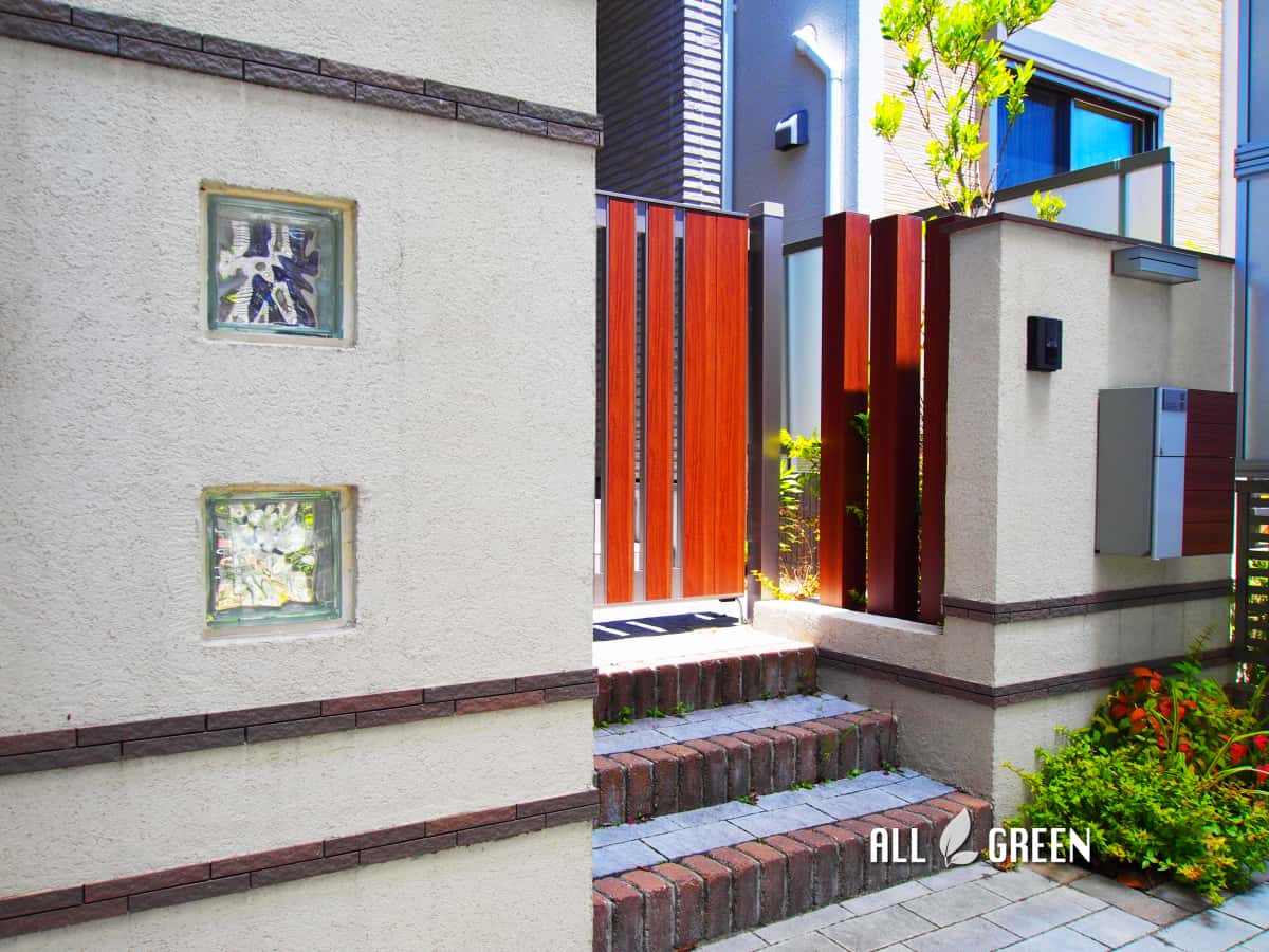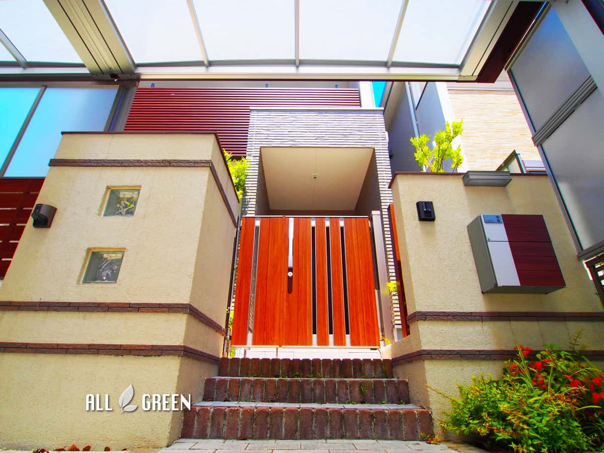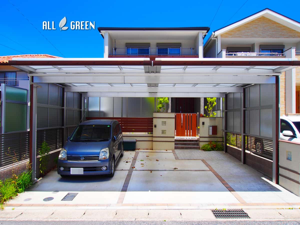 長久手市にある青空に映える木調ラインの入ったカーポート
