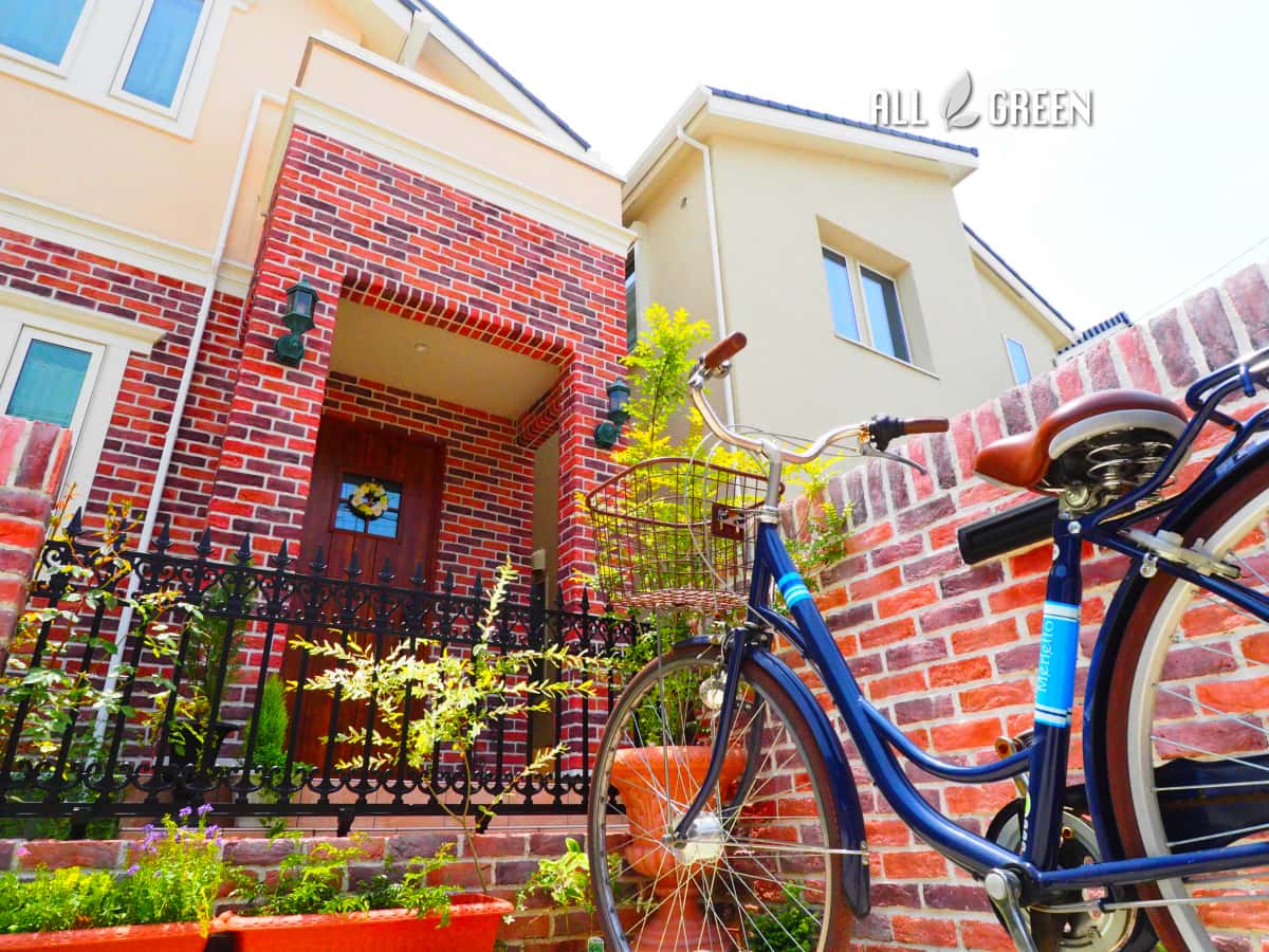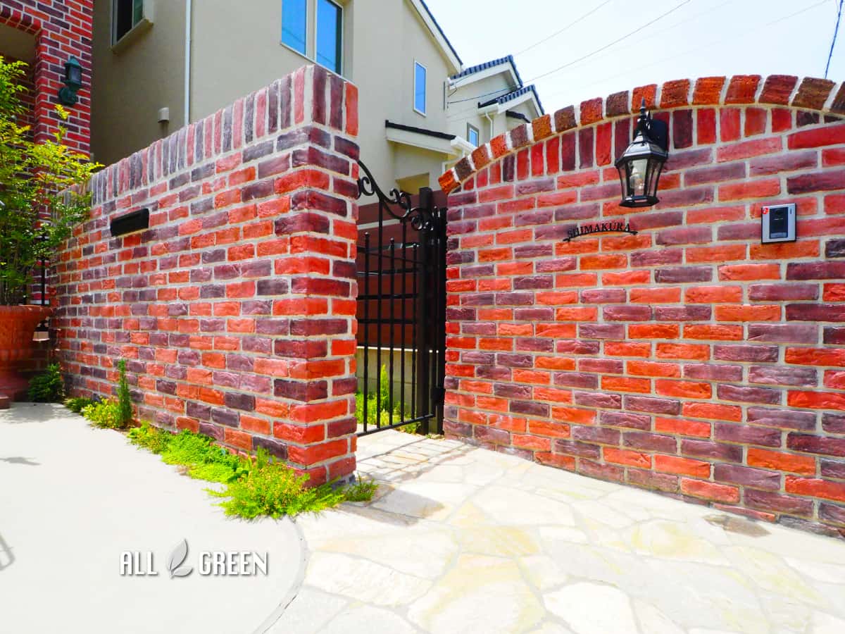 建物と同じ外壁を使った門塀はレンガ張りで丸みを帯びたアールに加工。ダークカラーの門扉・フェンス・照明・はアイアン調の商品を使うことでクラシカルかつヨーロピアンな雰囲気に仕上げています。表札は門塀と同じカーブがかったアーチ状のものを選択し統一感を。
