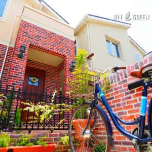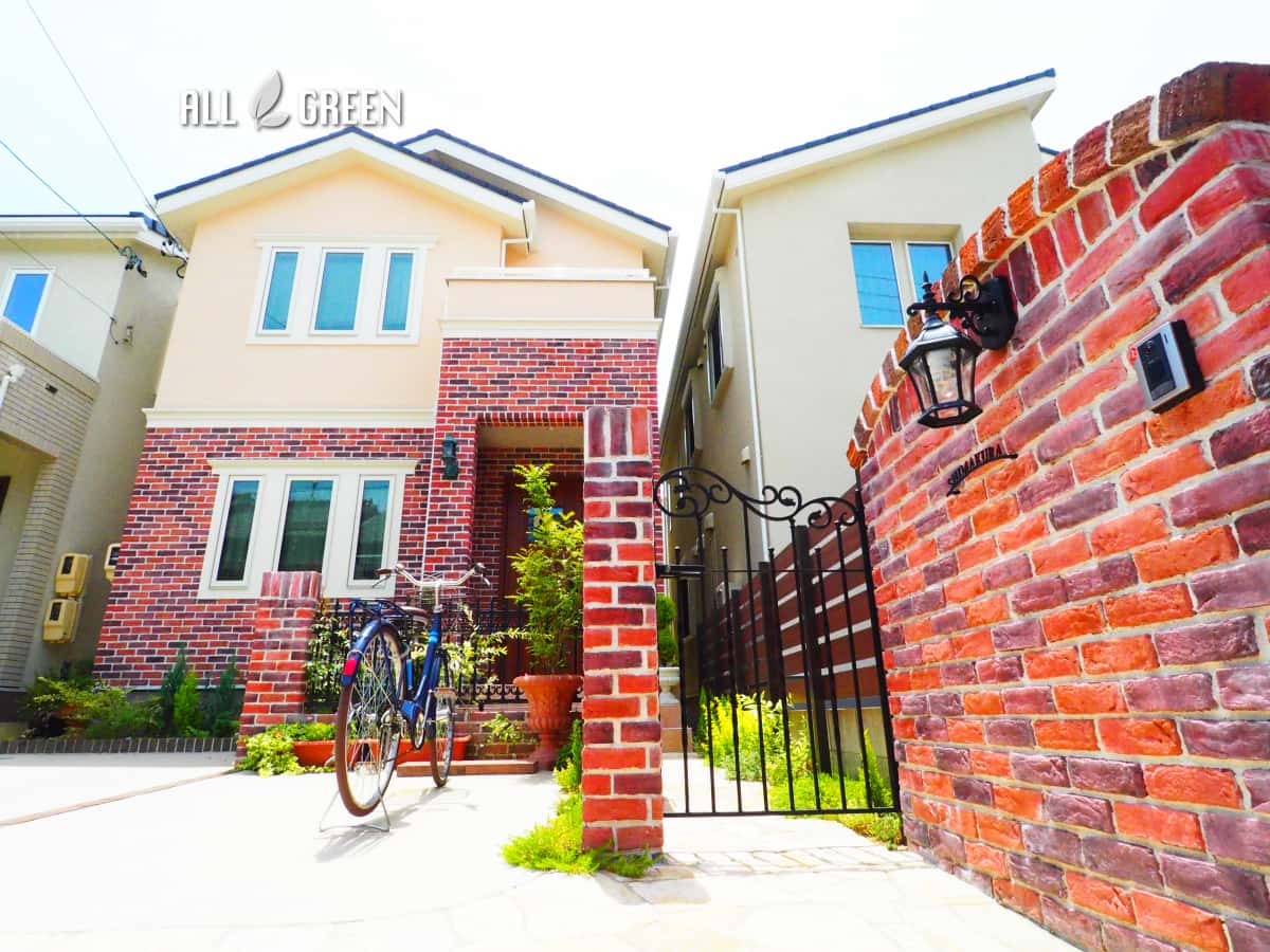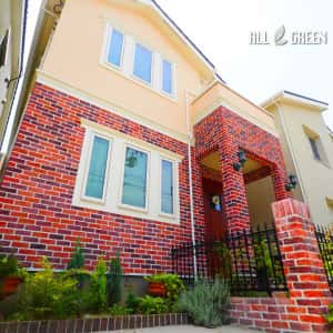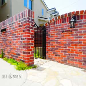 建物と同じ外壁を使った門塀はレンガ張りで丸みを帯びたアールに加工。ダークカラーの門扉・フェンス・照明・はアイアン調の商品を使うことでクラシカルかつヨーロピアンな雰囲気に仕上げています。表札は門塀と同じカーブがかったアーチ状のものを選択し統一感を。