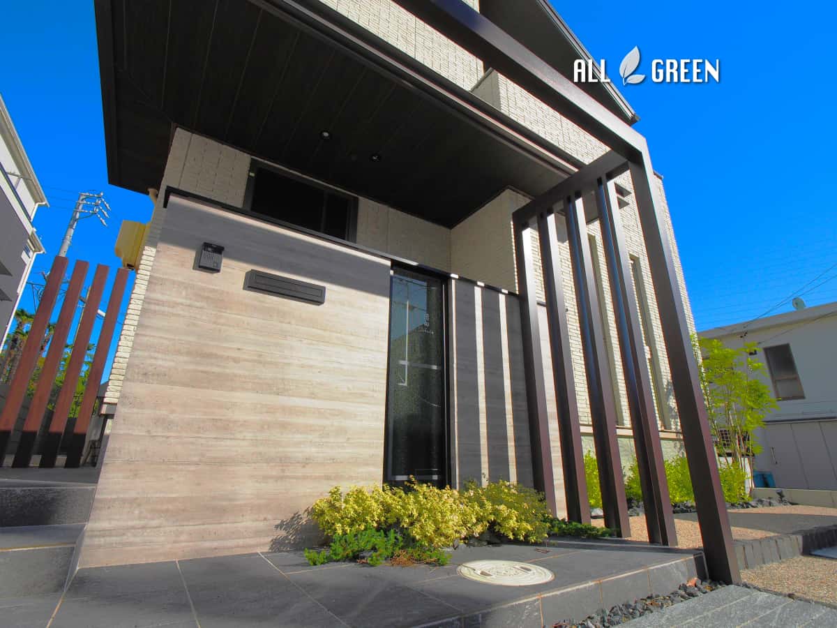 ガラスと木調フレームとボードをお洒落に組み合わせた名古屋市天白区の新築外構