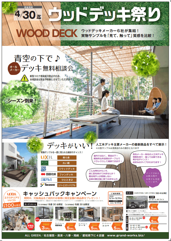大型サンプルウッドデッキは各メーカーさんのご厚意で4月末(延長の可能性あり)までオールグリーン清須店にて展示いたします。