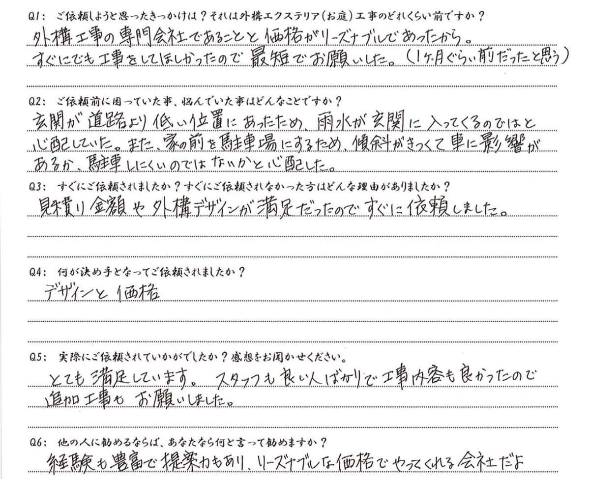見積もり金額や外構デザインが満足だったのですぐに依頼しました。