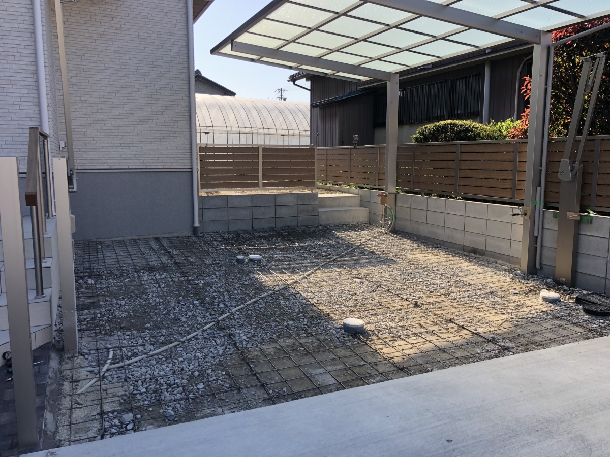 カーポートとオーバーゲートの柱の施工も終わり駐車場の土間コンクリートの準備が終わりました。