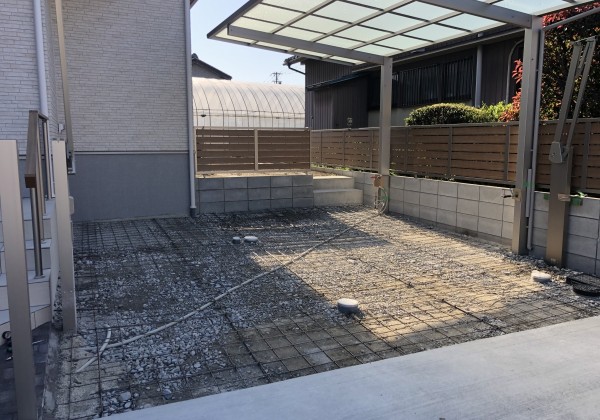 カーポートとオーバーゲートの柱の施工も終わり駐車場の土間コンクリートの準備が終わりました。 格子状に見えるのがメッシュ筋といって...