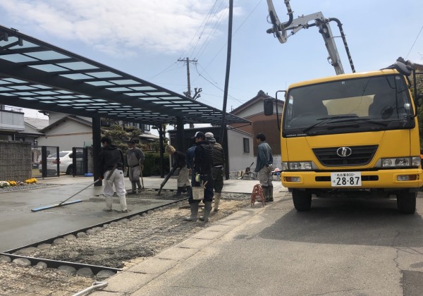 いよいよコンクリートの打設が始まりました。 かなりの量のコンクリートを使用するので今回はポンプ車を使用しての打設です。 面積が広...
