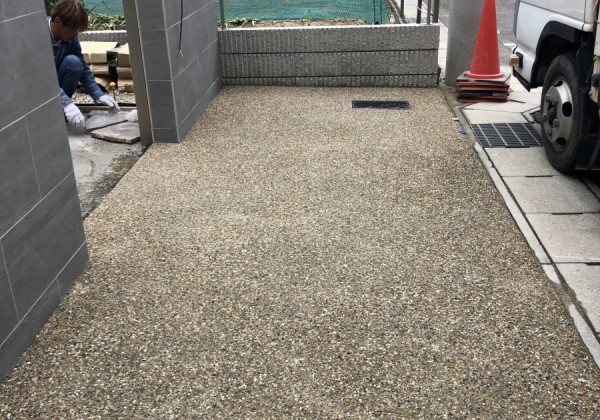 いよいよアプローチ工事になりました。 門塀の前は洗い出し仕上げです。洗い出しはコンクリート打設後に薬品を噴霧して表面だけ固まるの...