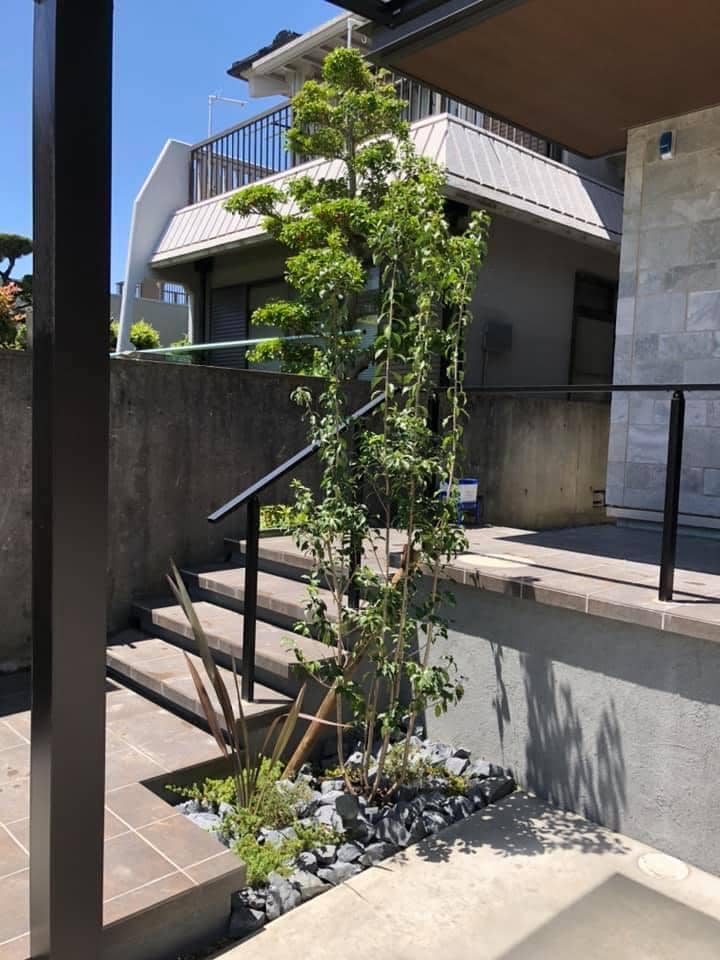アプローチから歩いて浮遊感のあるタイル階段とシンボルツリーが素敵ですね。