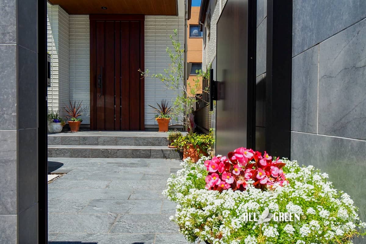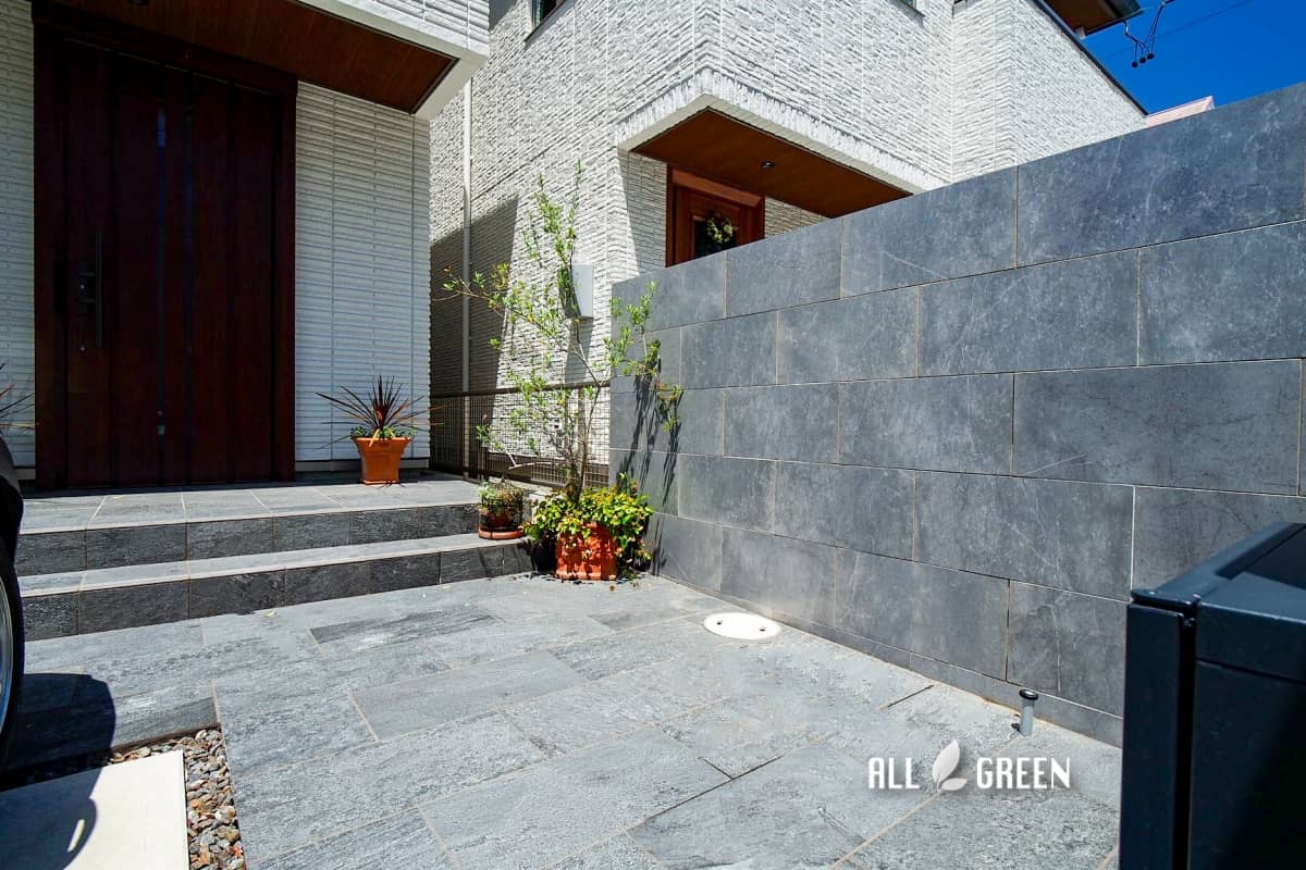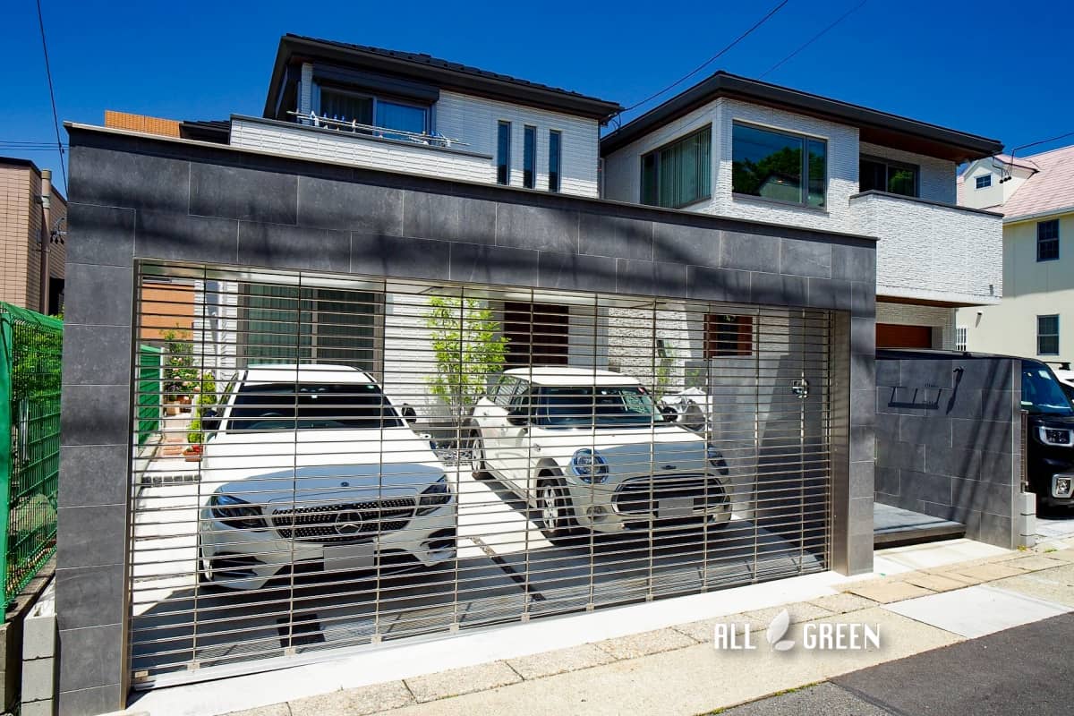 艶のあるタイルとシャッターゲートが特徴の名古屋市千種区にあるクローズ外構