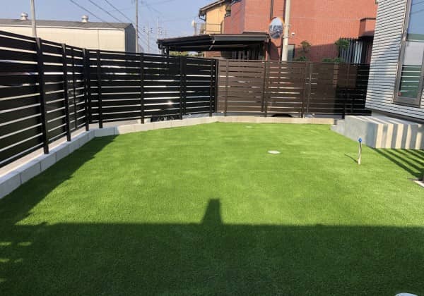 人工芝が完成しました。 人工芝の下はというと単粒砕石、山砂、防草シートそれの上に人工芝です、 4層になっています。単粒砕石は水は...