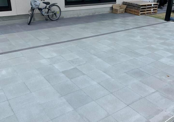 駐車場の床が完成しました。 全面に30cm角の平板を敷き詰めさせて戴きました。 圧巻の仕上がりになりました。 さぁ残りは植栽です...
