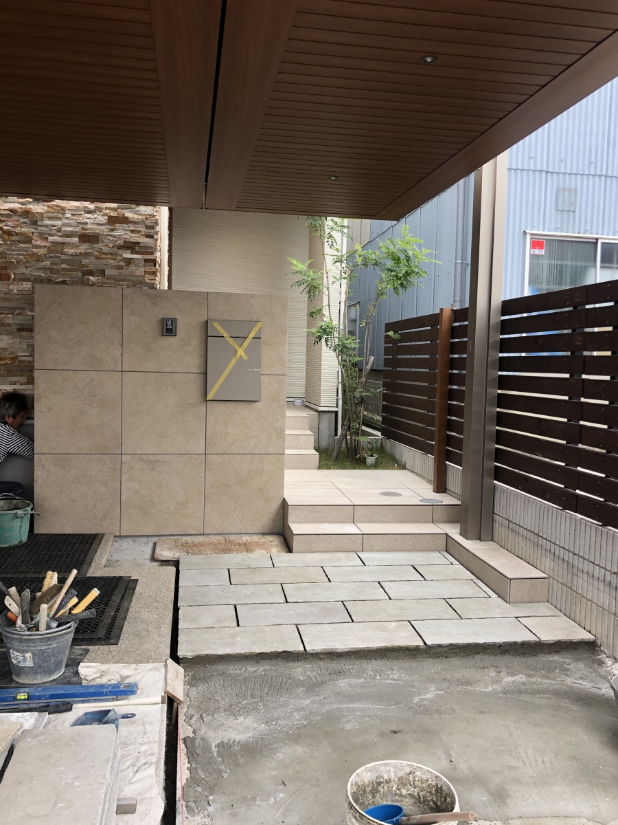 門塀タイルも終わりアプローチのいの平板敷の作業です。
