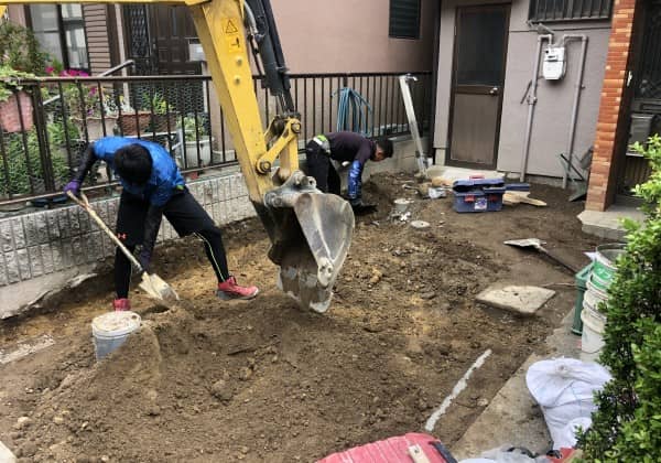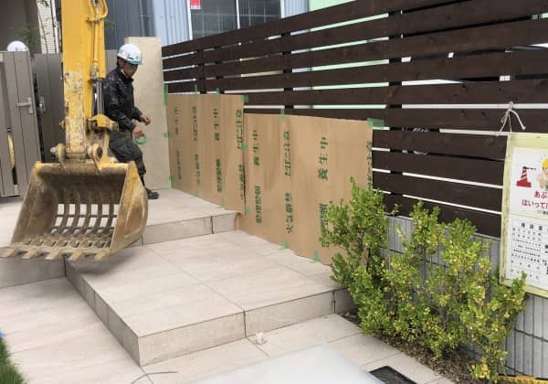 今回はリフォーム工事で既設のアプローチを撤去して駐車場を拡張します。 まずは解体にともない周りをしっかり養生します。 門塀も新し...