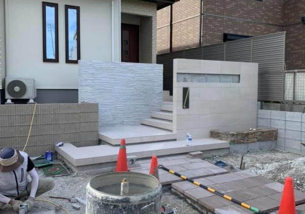 門塀のタイル、階段のタイル、アプローチの平板が終わりました。 あとは土間コンクリートです。 完成間近です。 素敵な門塀とアプロー...