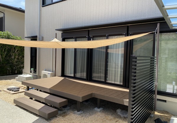 シェードの取り付けが完了しました。 これからの時期にはピッタリですね。 広いウッドデッキに日陰をつくります。 家の中にも直射日光...