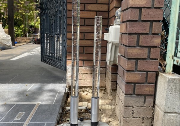 植栽工事と照明工事が終わりました。 素敵な門塀とアプローチですね。 広いお庭に人工芝で完成です。 楽しみですね。
