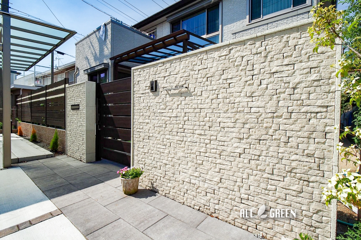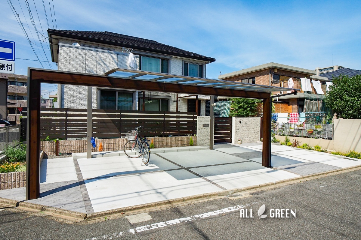 駐車場、アプローチ、カーポート、門塀、ポスト、表札、スライド門扉