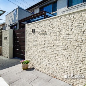 建物外壁と同じ凹凸のあるパストラーノはその柔らかい色合いから高級感とともに優しい印象も演出してくれるので、カーポートや門扉、そしてこれからご紹介させていただきますフェンスの木調色とも映える門塀となりました。
