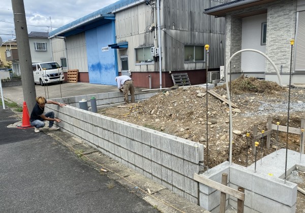 ブロック積みも進んでまいりました。 雨の影響で少し遅れ気味ですがブロック積みで 挽回しております。 門塀は杉板模様のタイルです。...