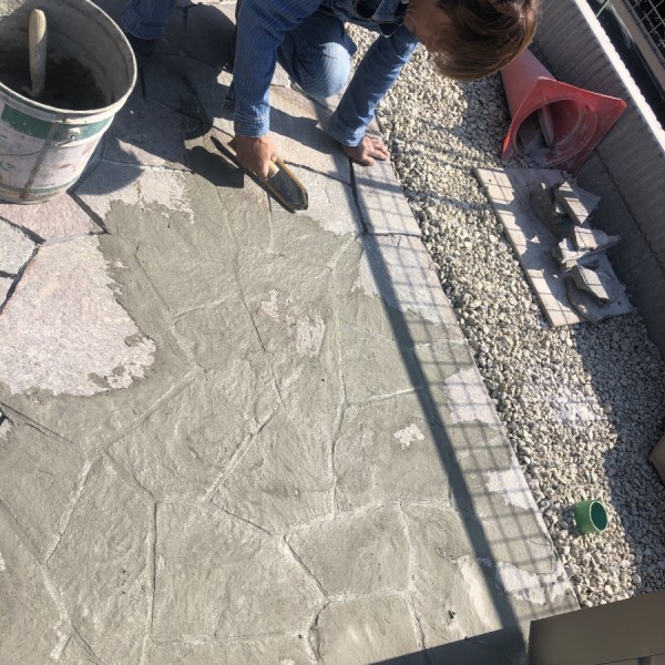 石も貼り終わり目地の作業です。 ゴムのコテで目地材を石と石の間に入れ込んで最後にスポンジで綺麗に拭き取ります。 拭き取りは結構な...