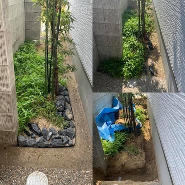 竹の根が心配とのご相談があり、今回は防根シートをご提案です。 竹の根は想像以上に強いので完璧に作業しました。 これで安心ですね。