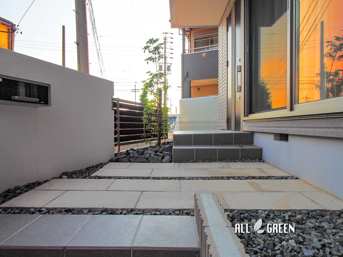 アプローチ:TOYO/カルムペイブ 平板敷き600✕300角(ホワイト)割栗石積み