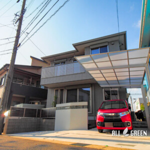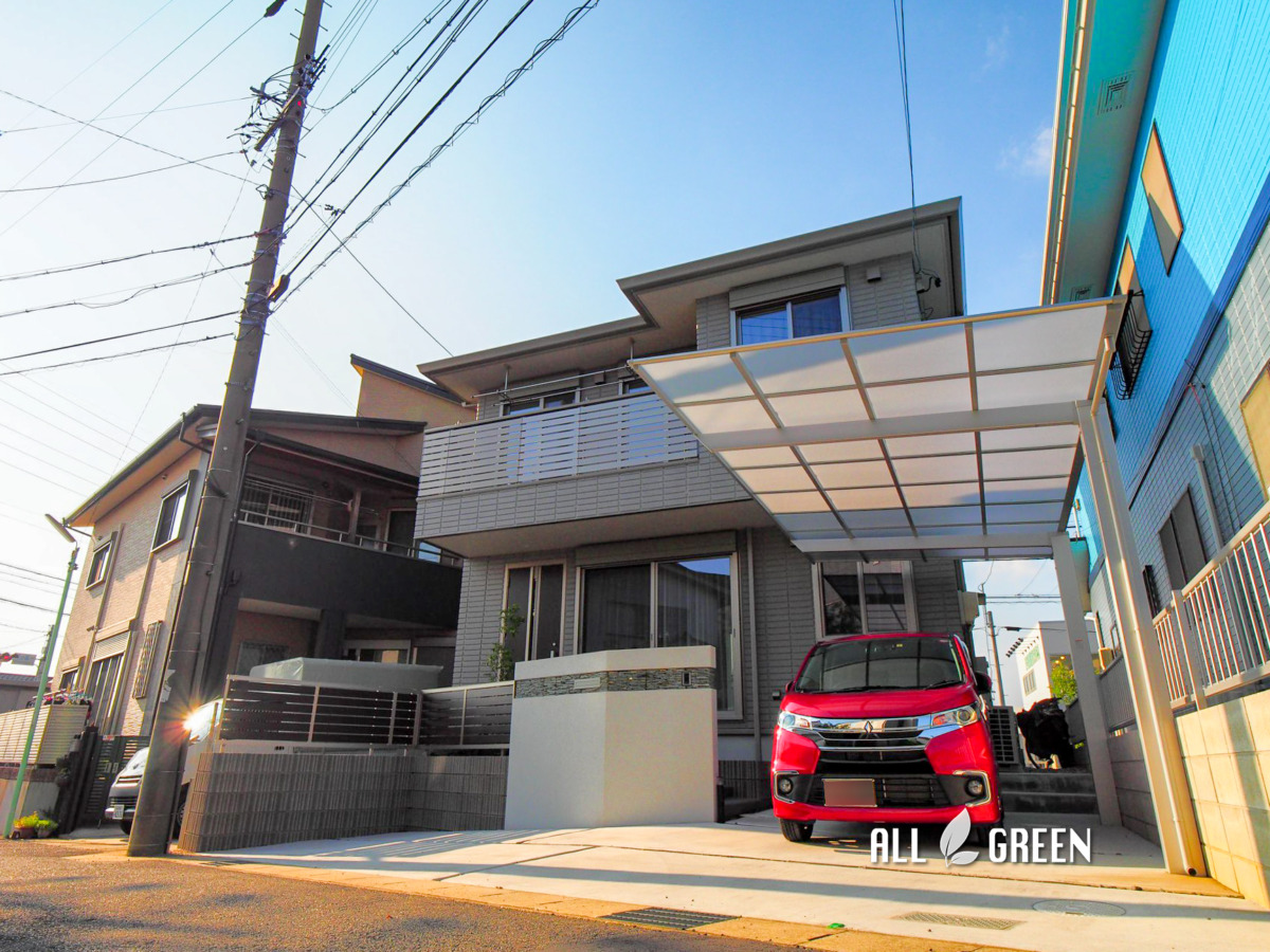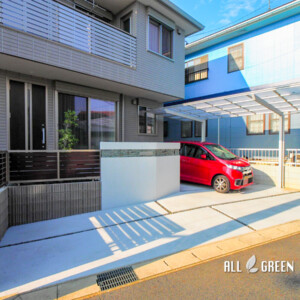 カーポートはLIXILのネスカFレギュラー1台用を設置、フラットスタイルで邸宅の雰囲気を崩さず調和しています。