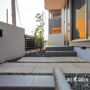 アプローチ:TOYO/カルムペイブ 平板敷き600✕300角(ホワイト)割栗石積み