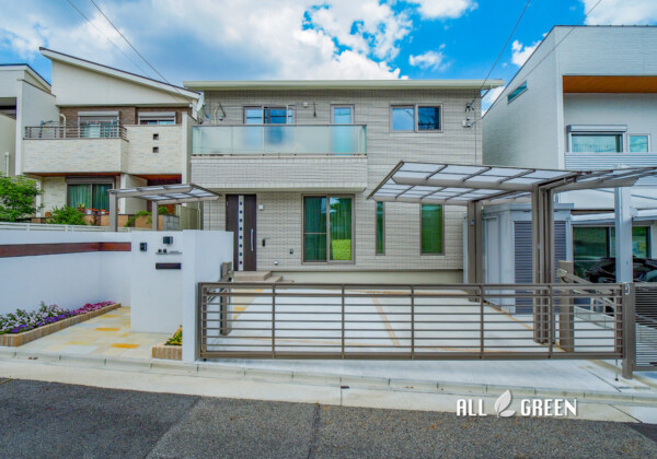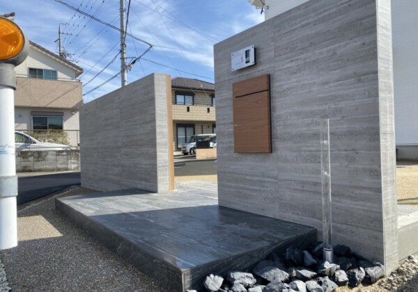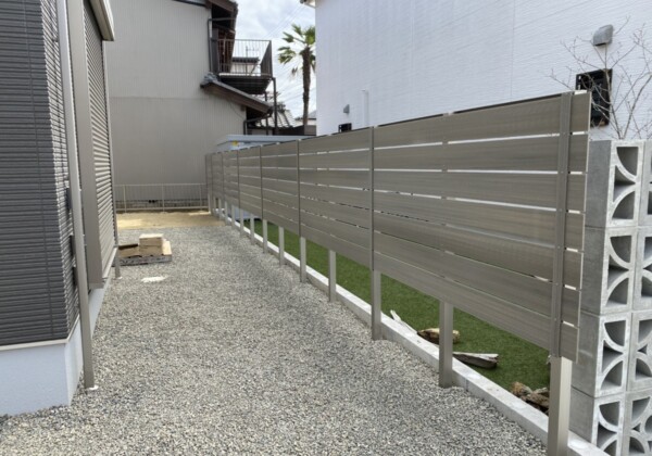 目隠しフェンスが完成しました。 木調フェンスですが色がグレーで 外壁の黒と合ってますね。