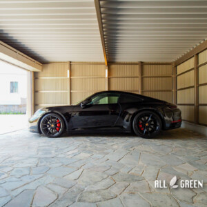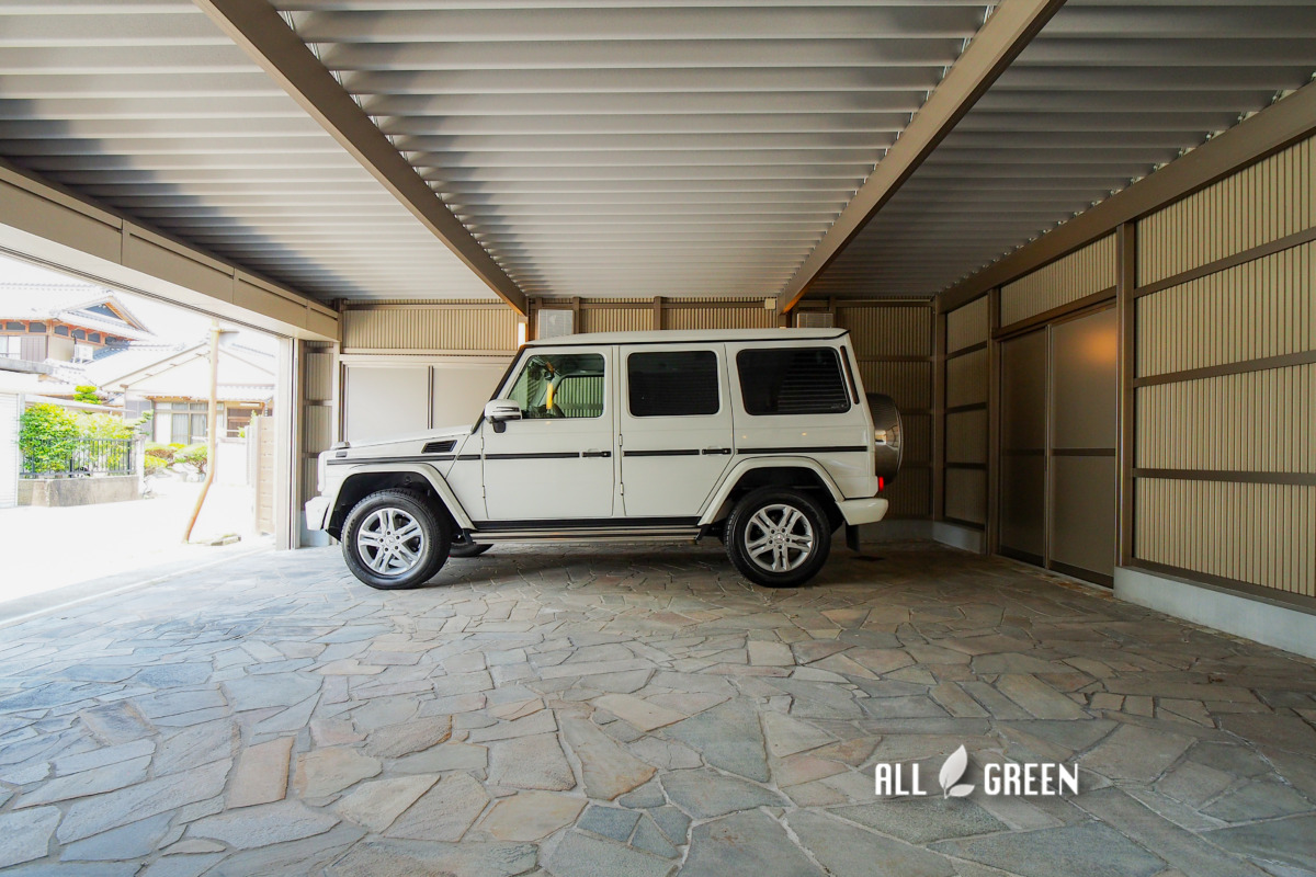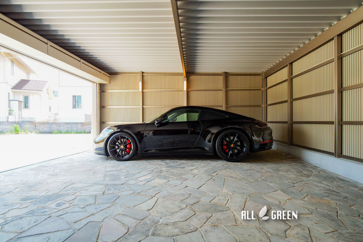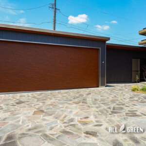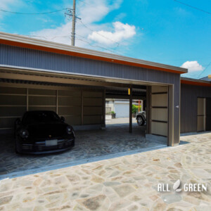 ダークグレーのガルバリウムで包まれた落ち着きのある折板ガレージ。尾張旭市のリフォーム外構