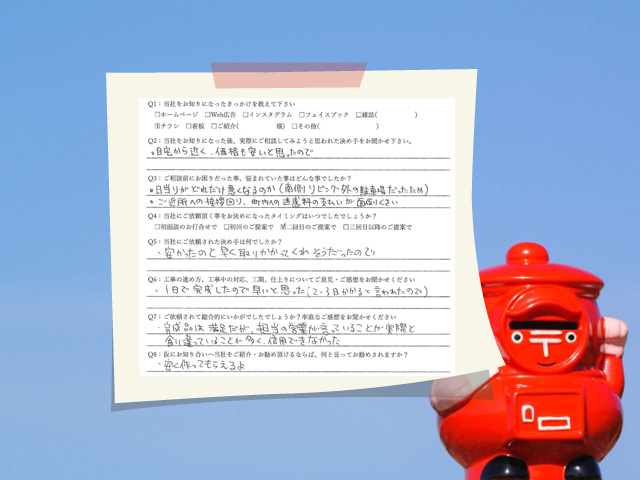 一日で完成したので早いと思った(2~3日かかると言われたので)