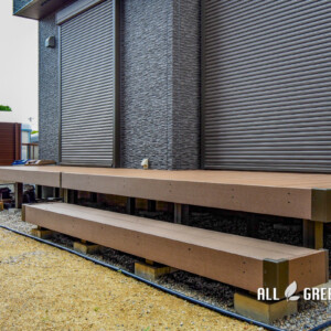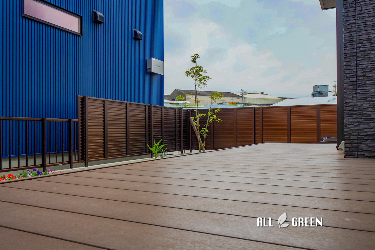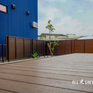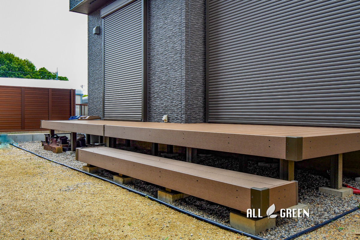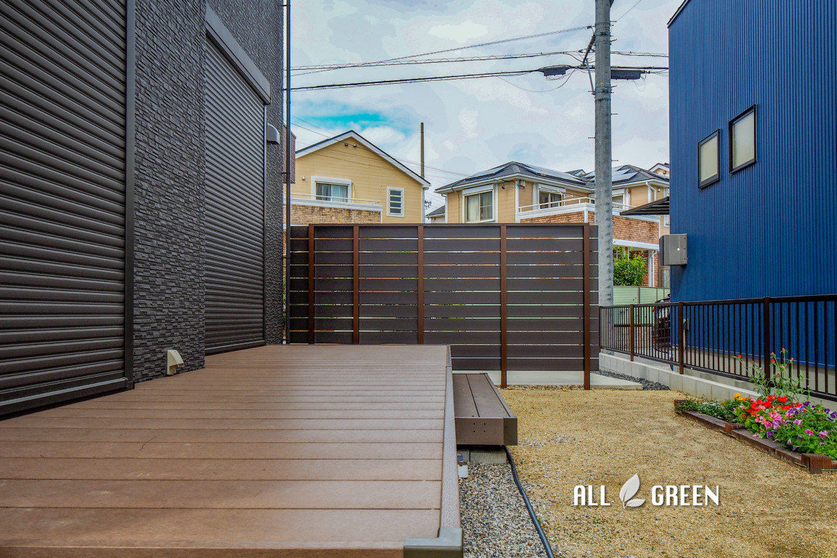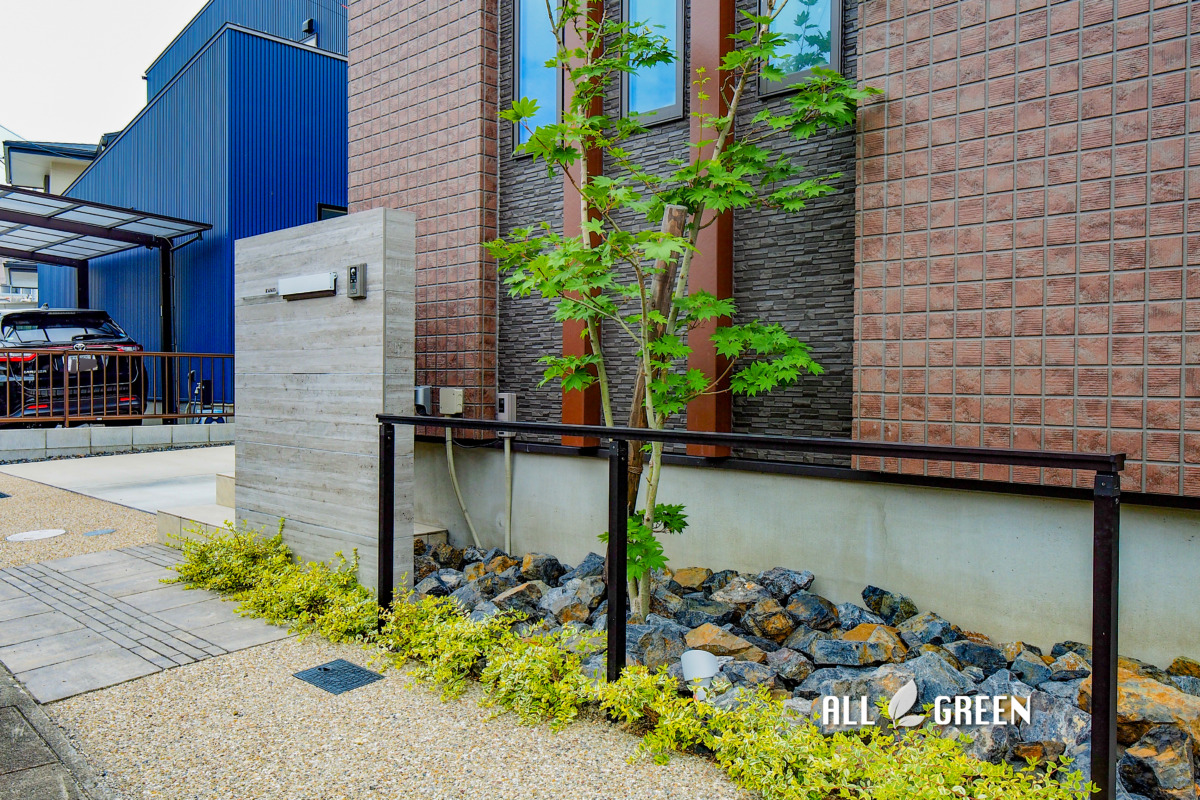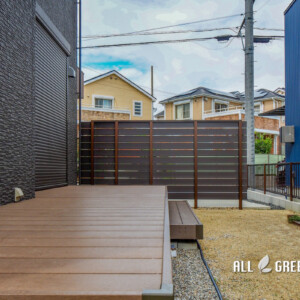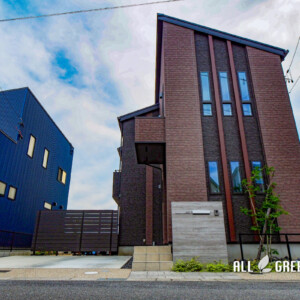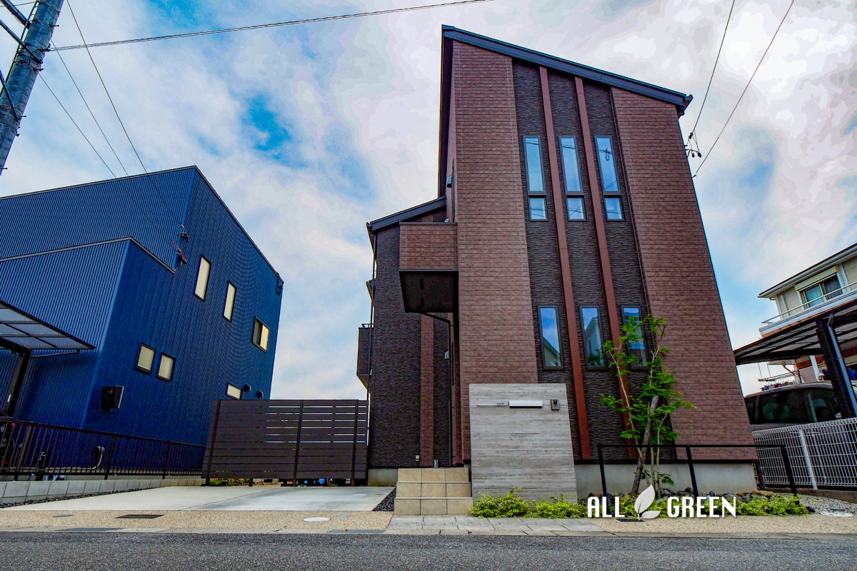 ブラウンを基調とした邸宅に門柱がアクセントを添えた日進市の新築外構