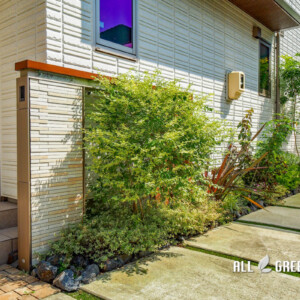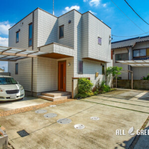 カーポートを2カ所に設けたことでスッキリとしたファサードに。江南市の新築外構