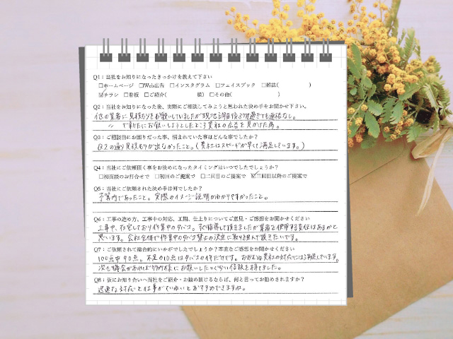 Q6:工事の進め方、工事中の対応、工期、仕上がりについてご意見・ご感想をお聞かせください