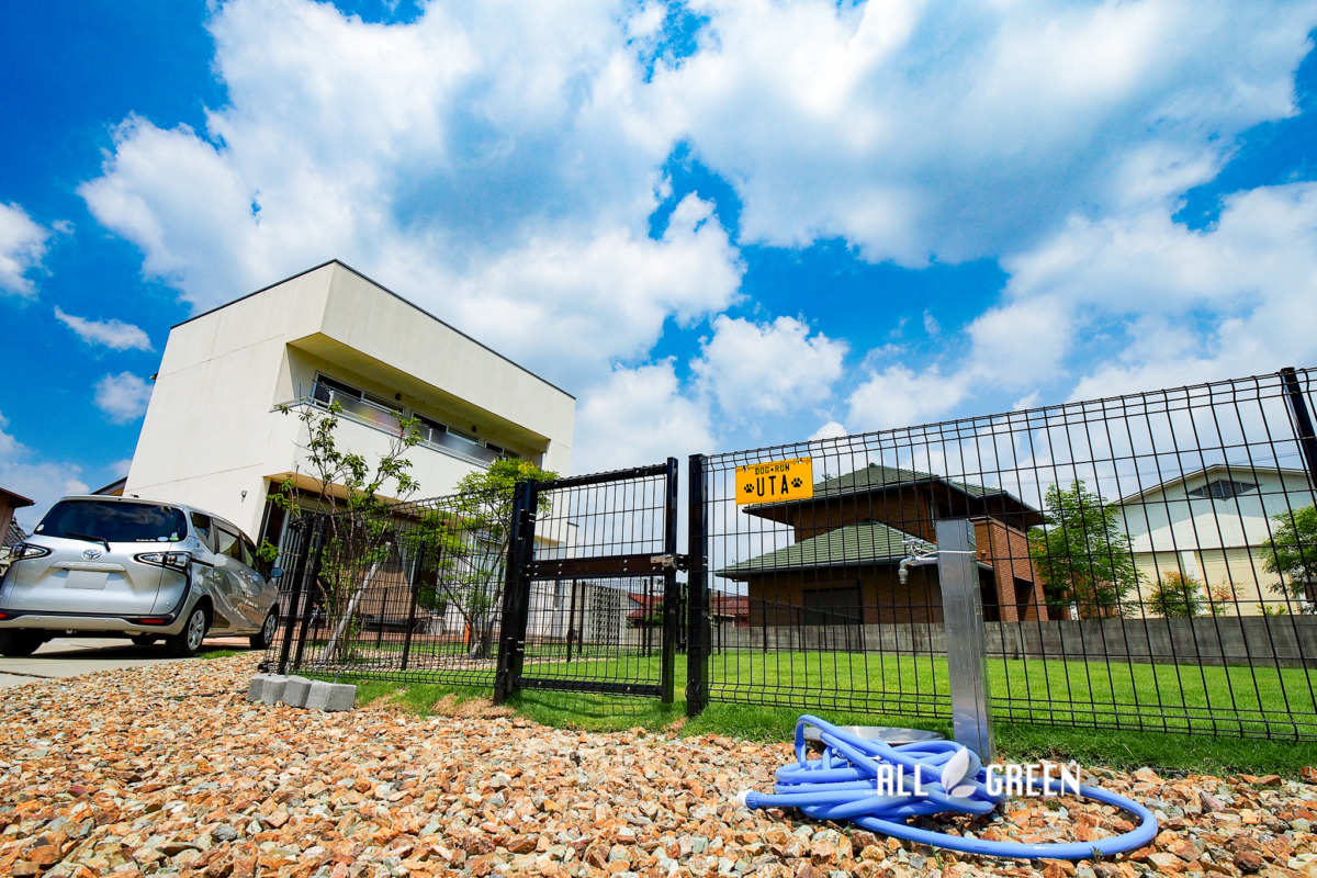 今回のご要望での必須項目は、今ある天然芝をはがして手入れが楽且つワンちゃんが走り回るのに適した人工芝に張り替えたい、人工芝に張り替えたお庭をフェンスで囲いワンちゃんを放しても外に出ていかないようにしたい、フェンスで囲ったドッグランへの出入りのため門扉を設置したいの3つ。これらをふまえて、デザインした外構はお施主様と何度も打ち合わせを重ね素敵なものが出来上がりました。