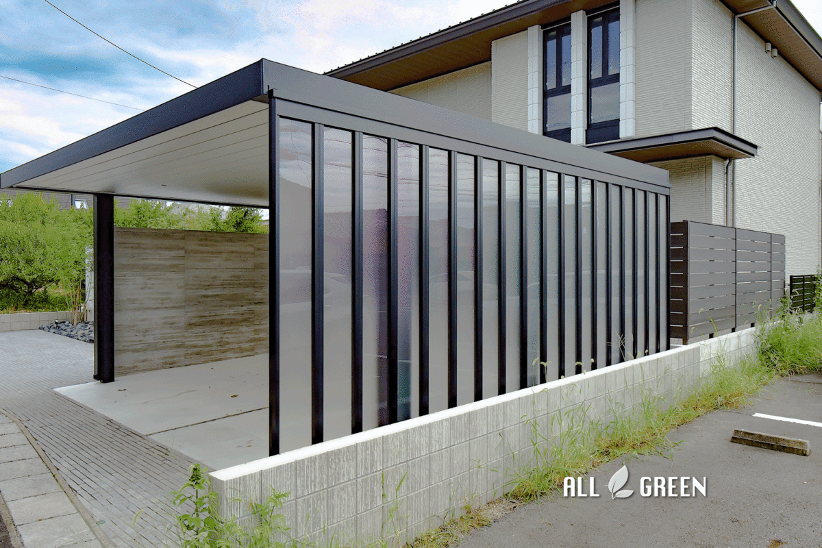 カーポートのオプションであるサイドパネルは、壁やフェンスではなくあえて光が差しこむパネルを使用することで、シンプルモダンなデザインの中に抜け感のある明るい印象を醸し出しています。お隣の敷地が月極の駐車場であるため気になる視線をブロックする役割も果たしています。