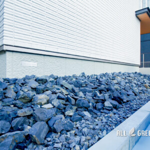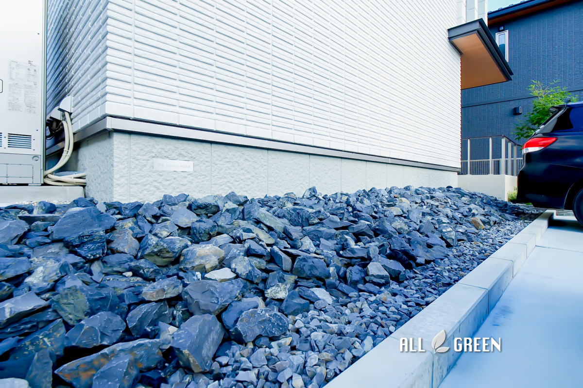 門柱とゲートフレームのふもとには、割栗石から植栽の下草が顔を出しておりナチュラルさがより醸し出されています。割栗石は、大きさ・形・色が様々であり洋風と和風のどちらの雰囲気の空間で使用しても大活躍してくれます。付近には照明も設置されているので夜間にライトアップされることで、立体感が演出されて陰影がくっきりするため明るい昼間とはまた違ったモダンなカッコいい表情を見ることができるのではないでしょうか。