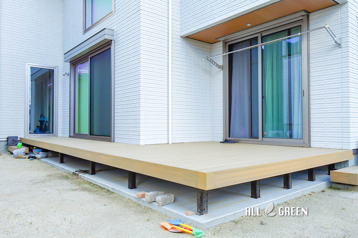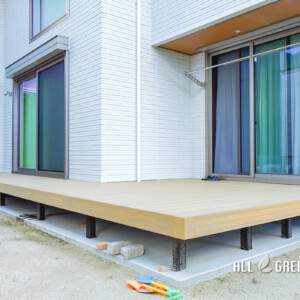 邸宅の反対側のお庭のスペースにはウッドデッキが設置されました。小さなお子様がいらっしゃるため、安心して元気いっぱい遊ぶことができるように、そしてお部屋の中からしっかり見守ることができるようにとデッキとお部屋の床が同じ高さで施工されています。さらにお部屋の床とデッキが同色であるため、窓を開けて開放させるとお部屋がより広くなったように感じることができます。隣のお部屋の前までデッキが伸びているので、中からでも外からでも行き来することが可能です。