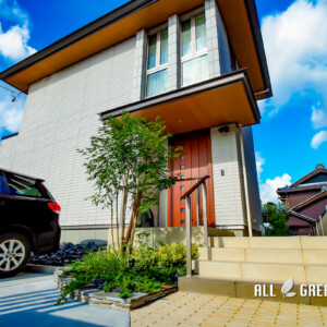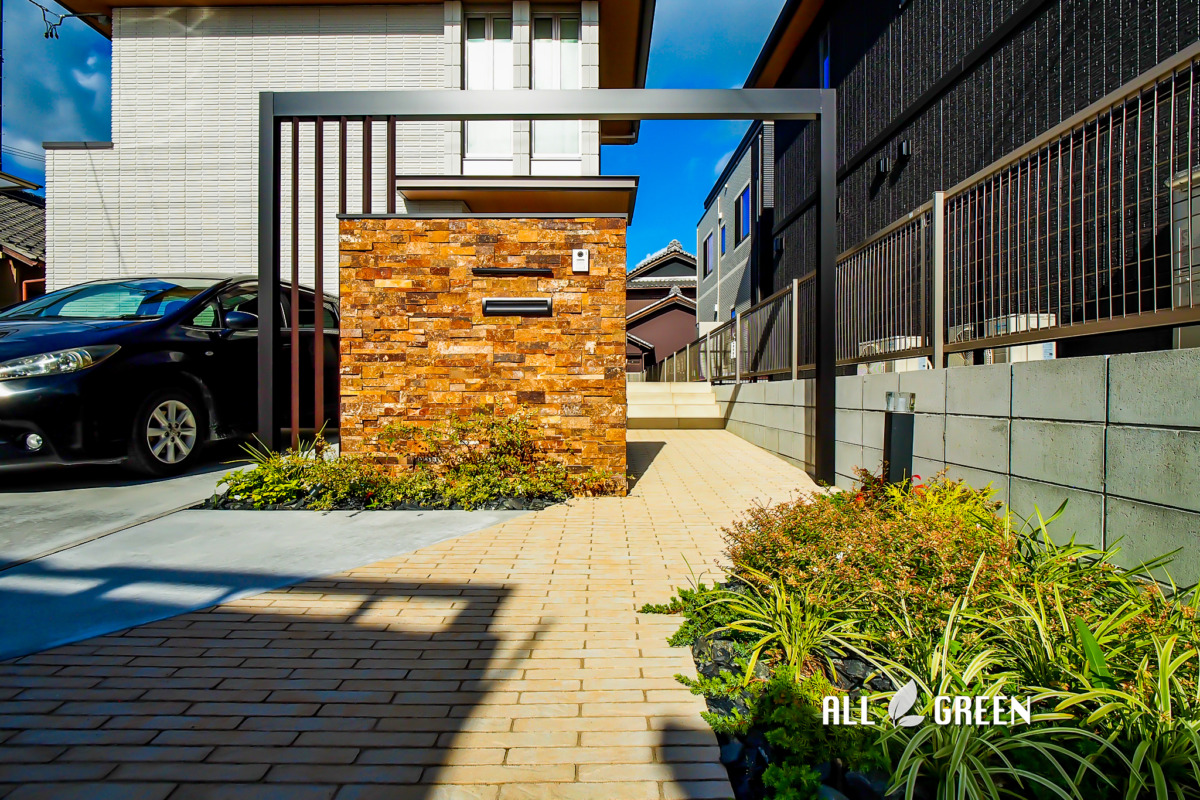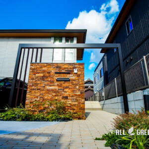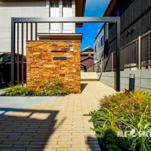 優しいナチュラルさがある雰囲気の中に、豪華で重厚感のある門柱がよく映えている外構が完成しました。
