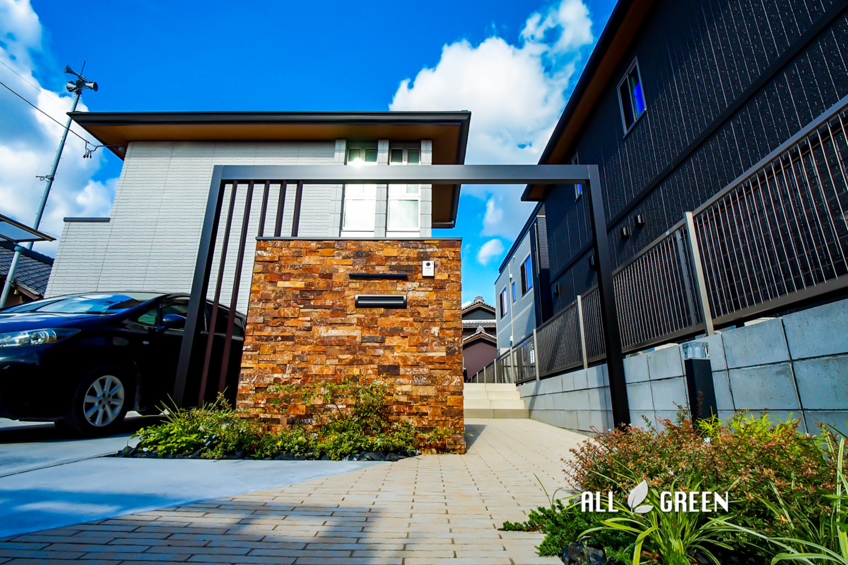 豪華な石張りの門柱が印象的な北名古屋市の新築外構