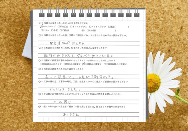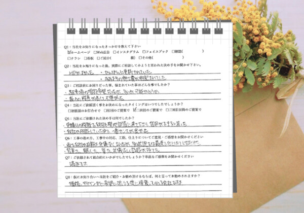 Q1:当社をお知りになったきっかけを教えてください ☑ ホームページ Q2:当社をお知りになった後、実際にご相談し...