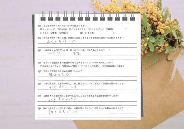 Q1:当社をお知りになったきっかけを教えてください ☑ ホームページ ☑ 看板 Q2:当社をお知りに...