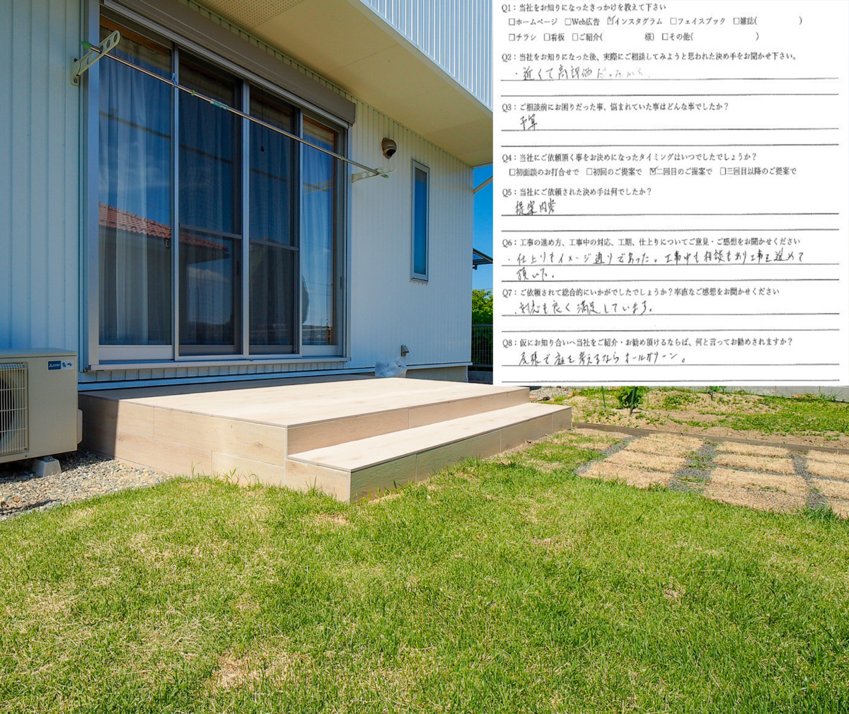 イメージ通りの仕上がりと対応の良さに満足しています。工事中も相談をしたり、頂いたりで工事を進めて頂けて良かったです。尾張で庭を考えるならオールグリーン!そう周りの方に勧めたいです。愛知県岩倉市/S邸